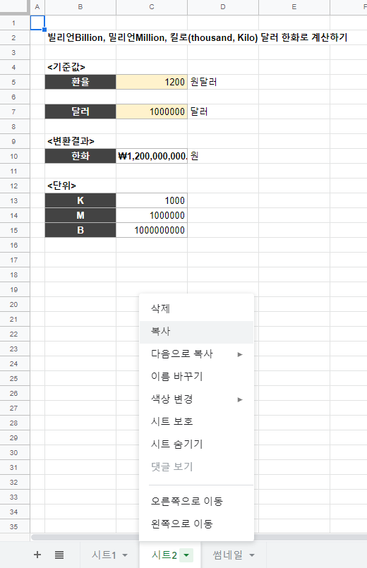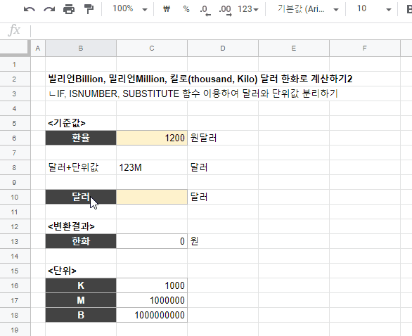 [구글 스프레드 시트 활용] 달러 한화로 계산하기 (빌리언Billion, 밀리언Million, 킬로(thousand, Kilo) 포함)