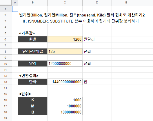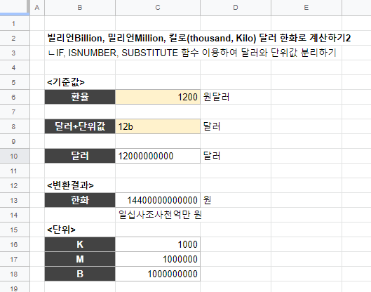 [구글 스프레드 시트 활용] 달러 한화로 계산하기 (빌리언Billion, 밀리언Million, 킬로(thousand, Kilo) 포함)