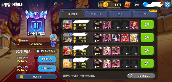 아레나 대전 상대는 내 전투력 기준으로 위아래가 골고루 배치되기 때문에,