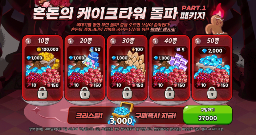 27000원짜리 혼돈의 케이크타워 돌파 패키지 part1을 구매하고 50층까지 클리어 시