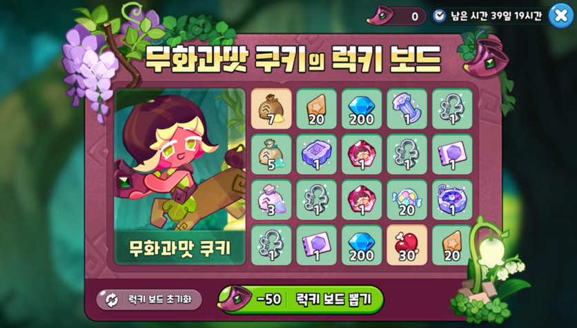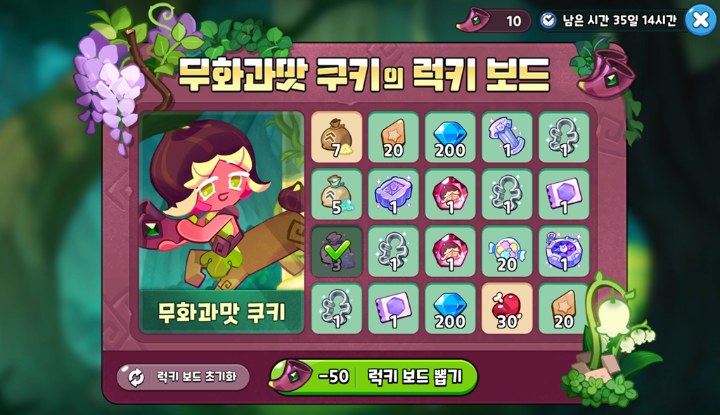 럭키보드에는 스킬파우더, 토핑조각, 다이아, 희귀재료, 쿠키커터, 보물뽑기권, 스테미너 젤리, 무화과맛 쿠키의 영혼석, 그리고 대망의 무화과맛 쿠키 완제가 준비되어 있습니다.
