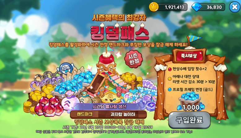 쿠키런 킹덤에는 '킹덤패스'라는 결제 패키지가 있습니다.