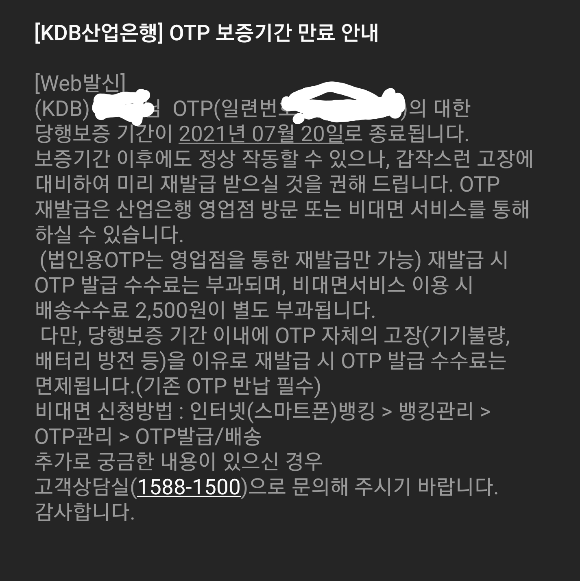 2018년에 재발급받았던 KDB 산업은행의 OTP의 배터리가 방전되었습니다.