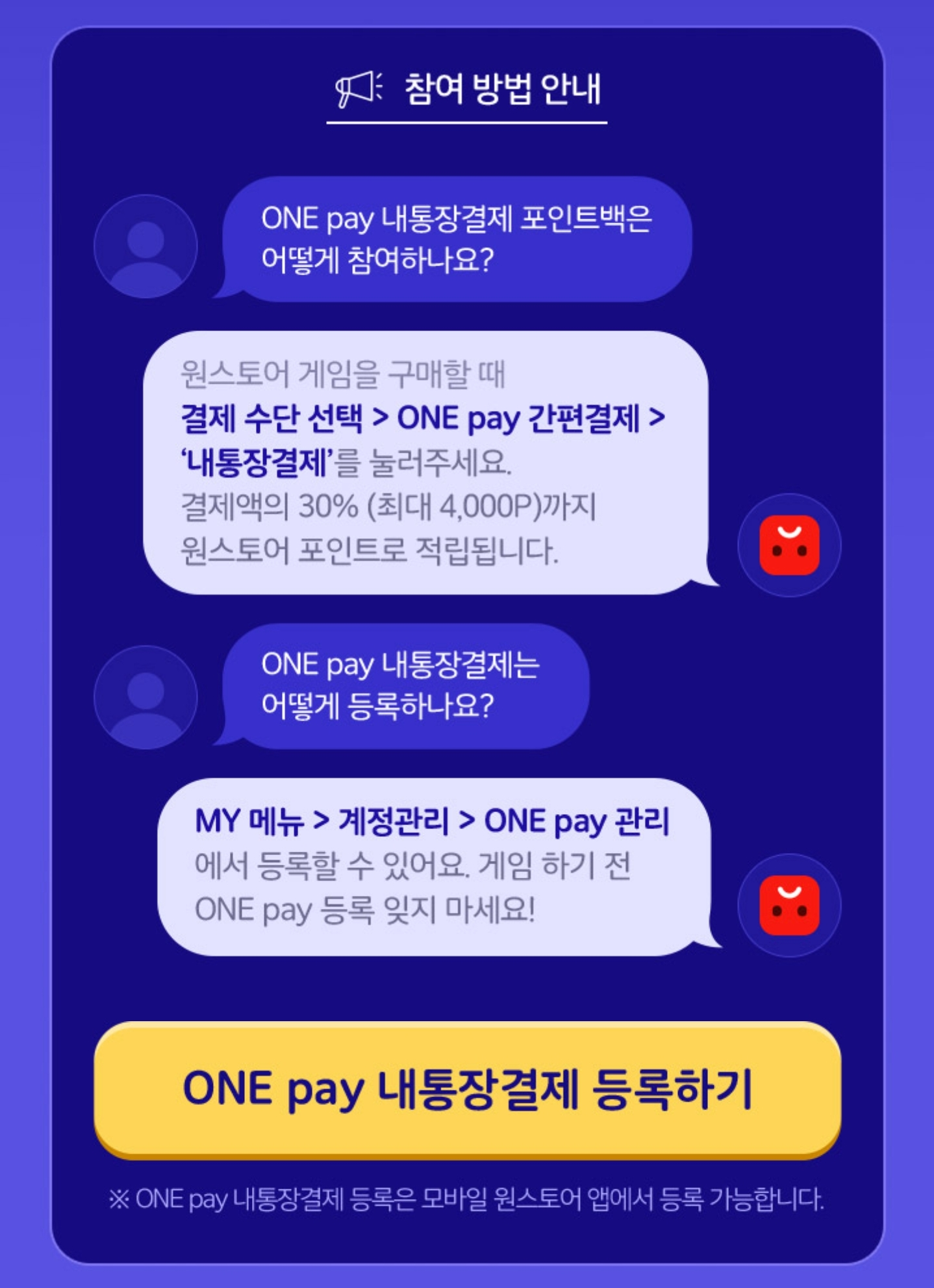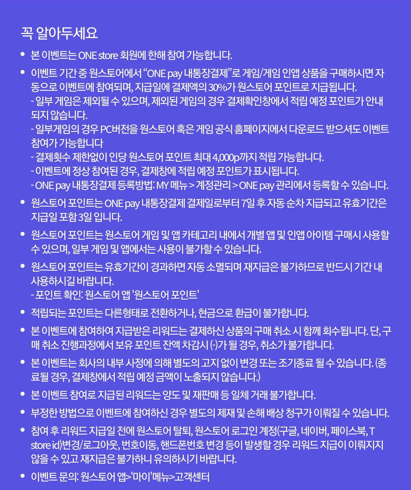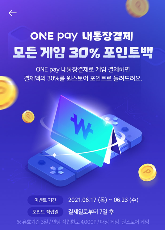 내통장결제를 등록하면 결제금액의 30%를 원스토어 포인트로 돌려주는 이벤트입니다.