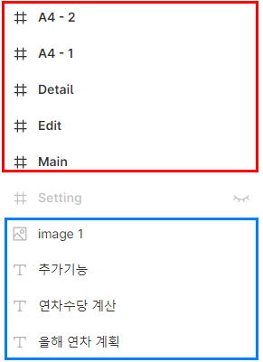 프레임으로 묶여있는 빨간색 영역은 내보내지지만, 파란색 영역 안의 개별 컴포넌트는 내보내지지 않습니다.