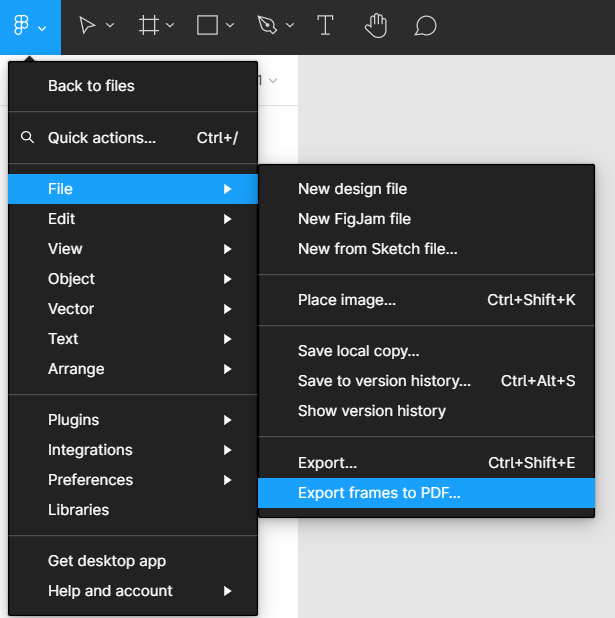 좌측 상단 피그마 로고를 누르고 file > export frames to PDF를 선택하면 전체 프레임을 PDF로 내보낼 수 있습니다.
