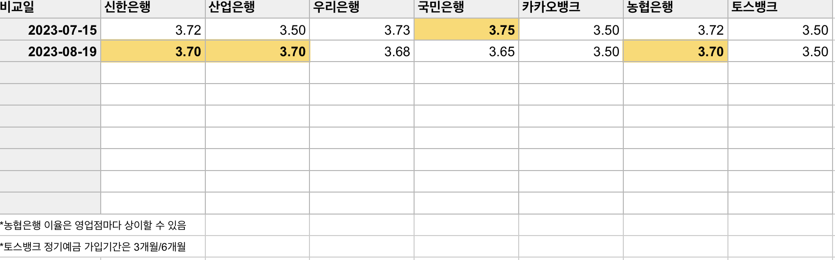 아무튼 2023-08-19 기준 7개 시중은행의 은행별 예금 이율을 정리해왔습니다.